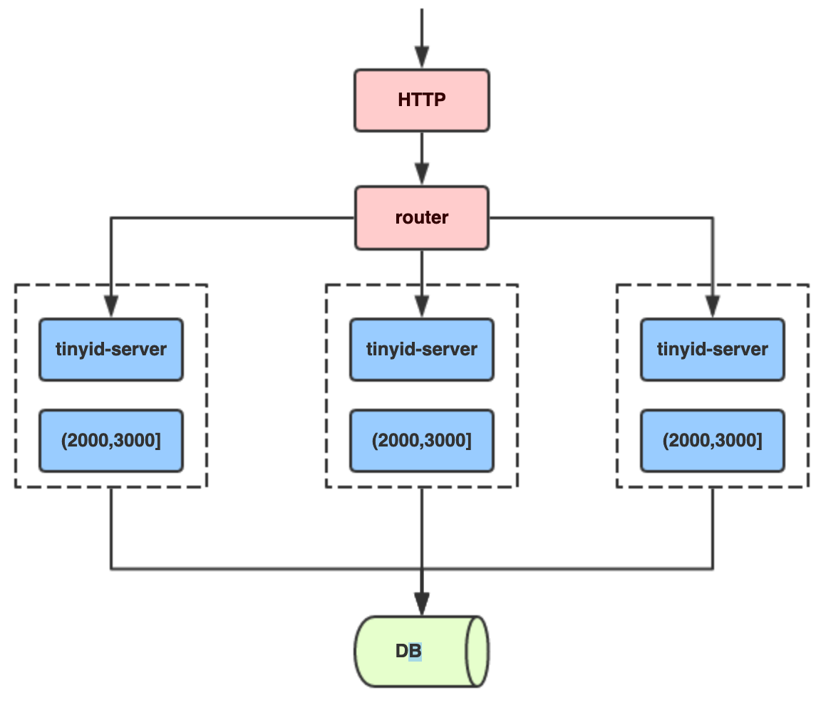 Tinyid的原理非常简单,通过数据库表中的数据基本是就能猜出个八九不离十,就是经典的segment模式;以同一个bizType为例,每个tinyid-server会分配到不同的segment,例如第一个tinyid-server分配到(1000, 2000],第二个tinyid-server分配到(2000, 3000],第3个tinyid-server分配到(3000, 4000]: