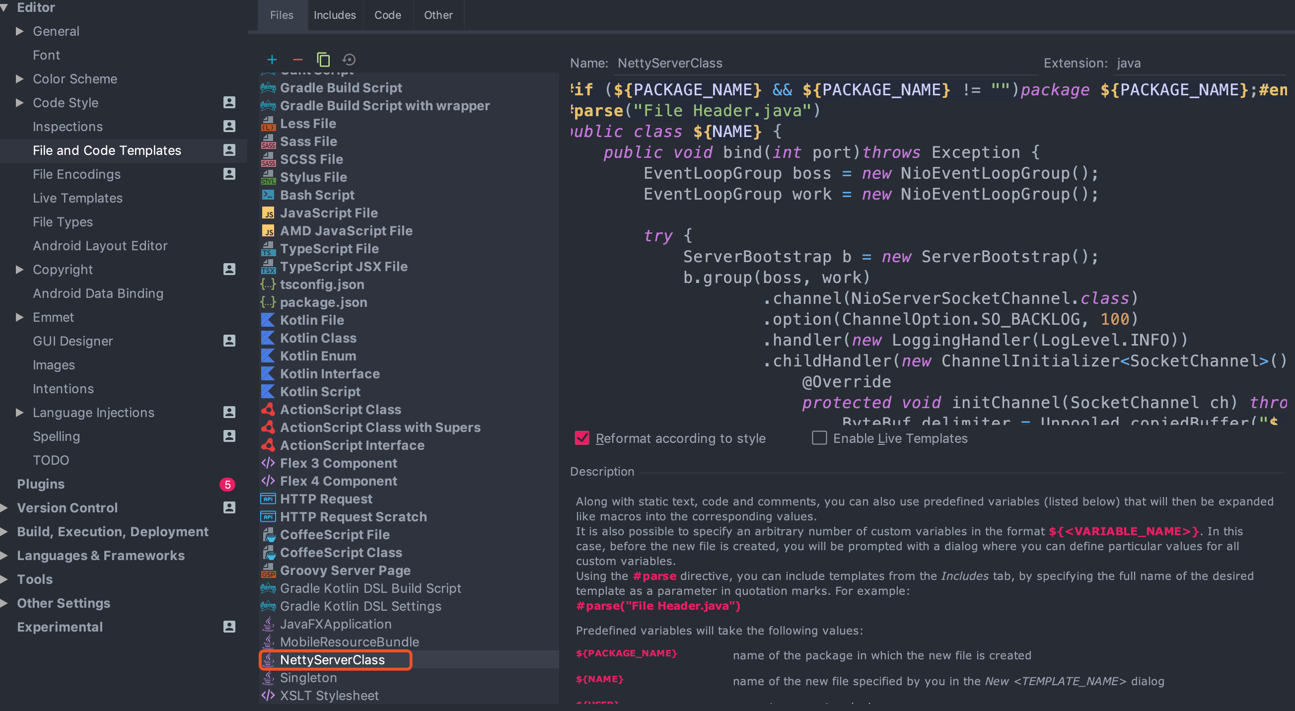 在new里面可以选择NettyServerClass作为Java类文件模板: