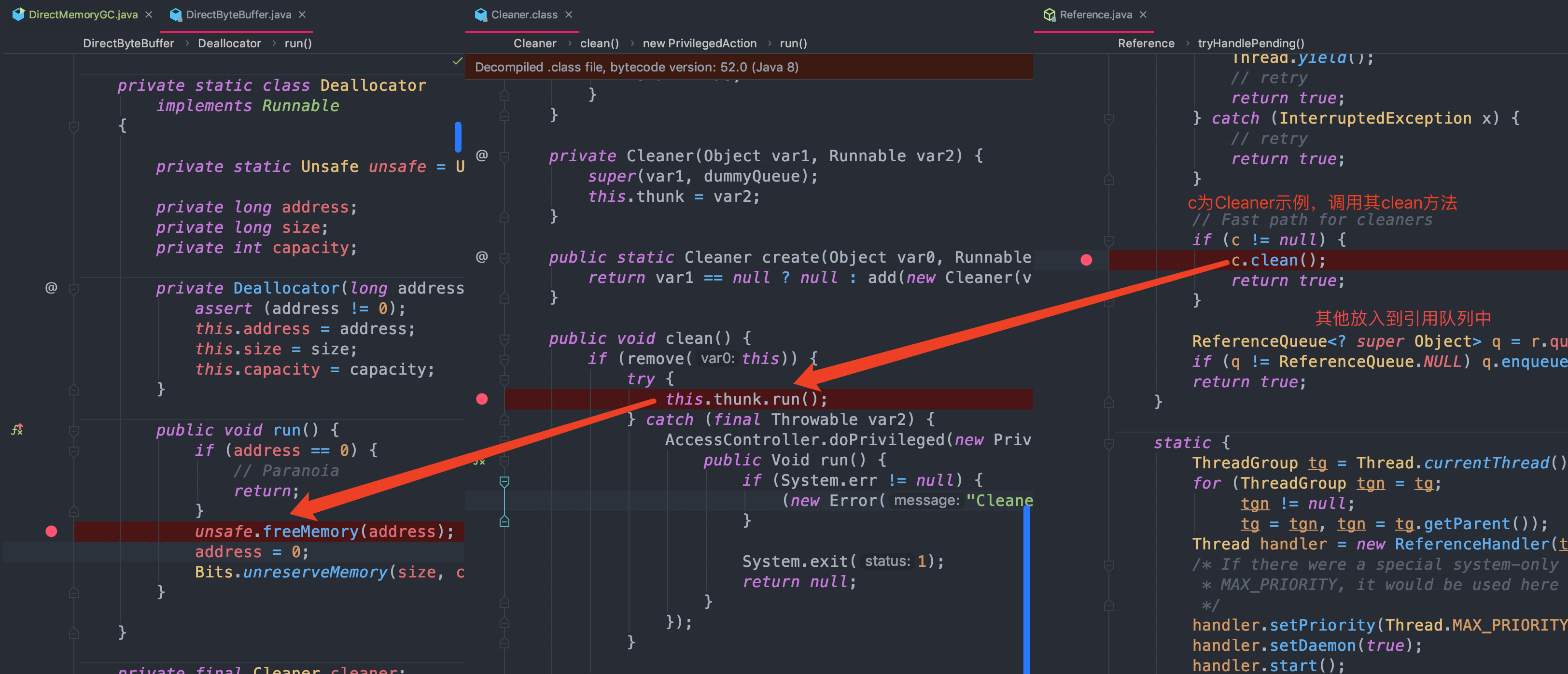 所以当DirectByteBuffer仅被Cleaner引用(即为虚引用)时,其可以在任意GC时段被回收。当DirectByteBuffer实例对象被回收时,在Reference-Handler线程操作中,会调用Cleaner的clean方法根据创建Cleaner时传入的Deallocator来进行堆外内存的释放