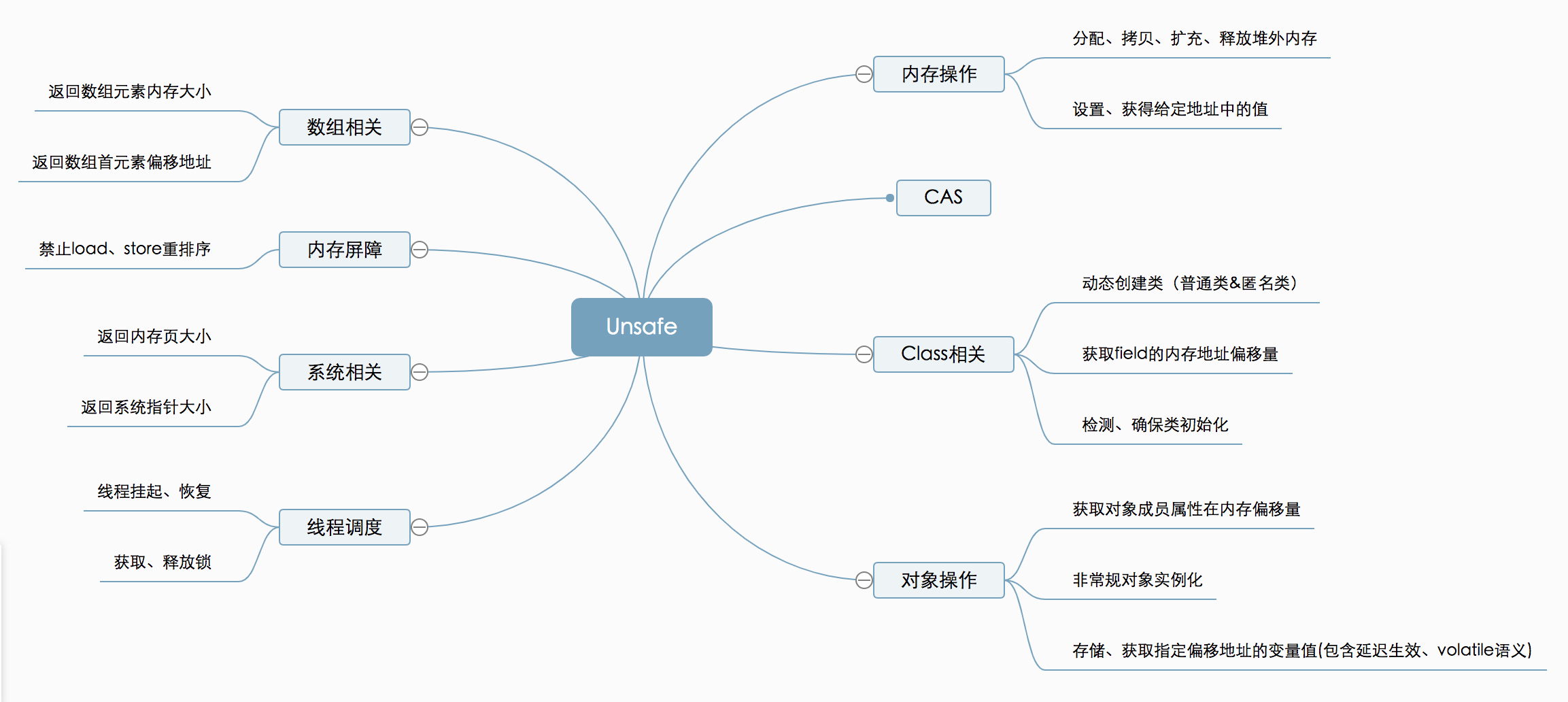 Unsafe提供的API大致可分为内存操作、CAS、Class相关、对象操作、线程调度、系统信息获取、内存屏障、数组操作等几类