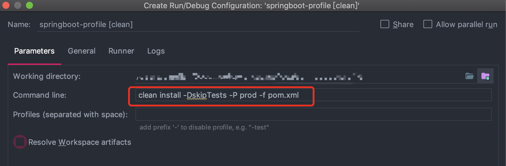 Create Run/Debug Configuration,弹出如下界面,并在 Command Line 中输入:clean install -DskipTests -P prod -f pom.xml