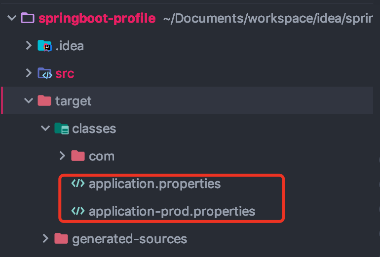 上述步骤2中激活指定的profile,但是最终的文件中都包含了所有properties文件,target目录结构如下: